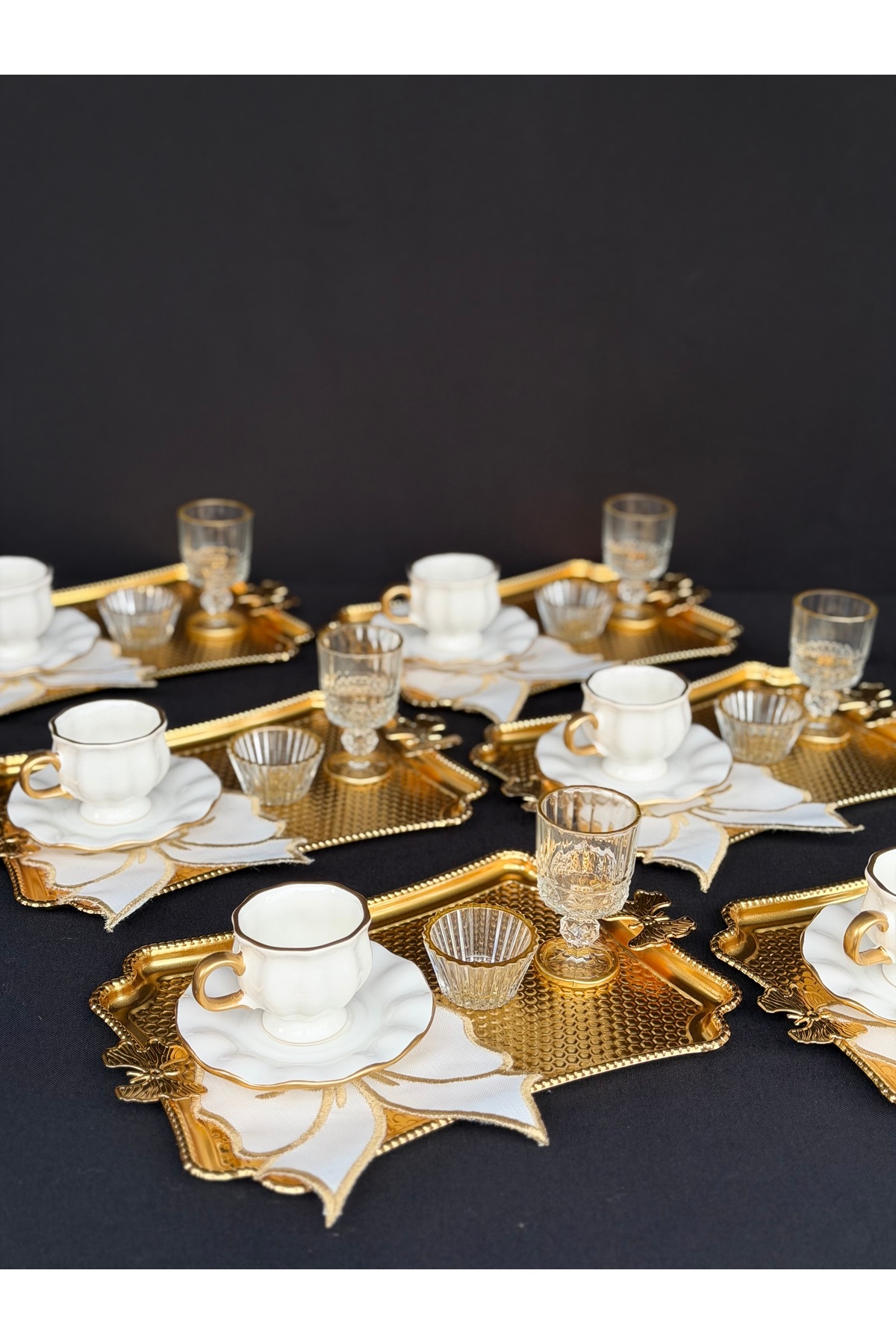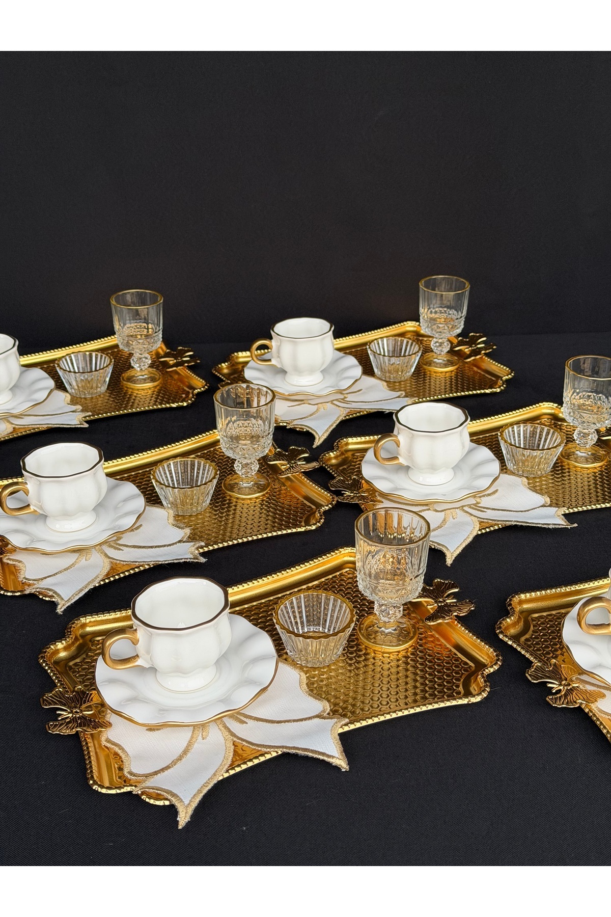 6 kişilik 36 parça full set, 6 adet metal tepsi, 6 adet fiyonklu peçetelik, 6 adet kanvas fincan, 6 adet fincan altı, 6 adet cam lokumluk, 6 adet cam kahve yanı su bardağı